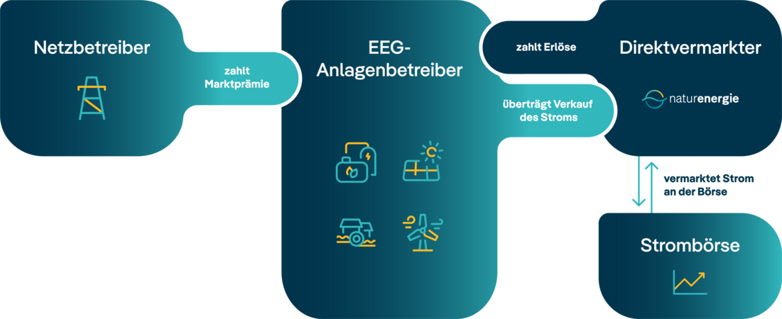 Als Direktvermarkter verkaufen wir Ihren erzeugten Grünstrom über das Marktprämienmodell an der Strombörse und zahlen Ihnen je nach Vergütungsmodell den Marktwert oder Spotpreis - abzüglich unserer Dienstleistungsgutschriften. Die Marktprämie erhalten Sie von Ihrem Netzbetrieb.